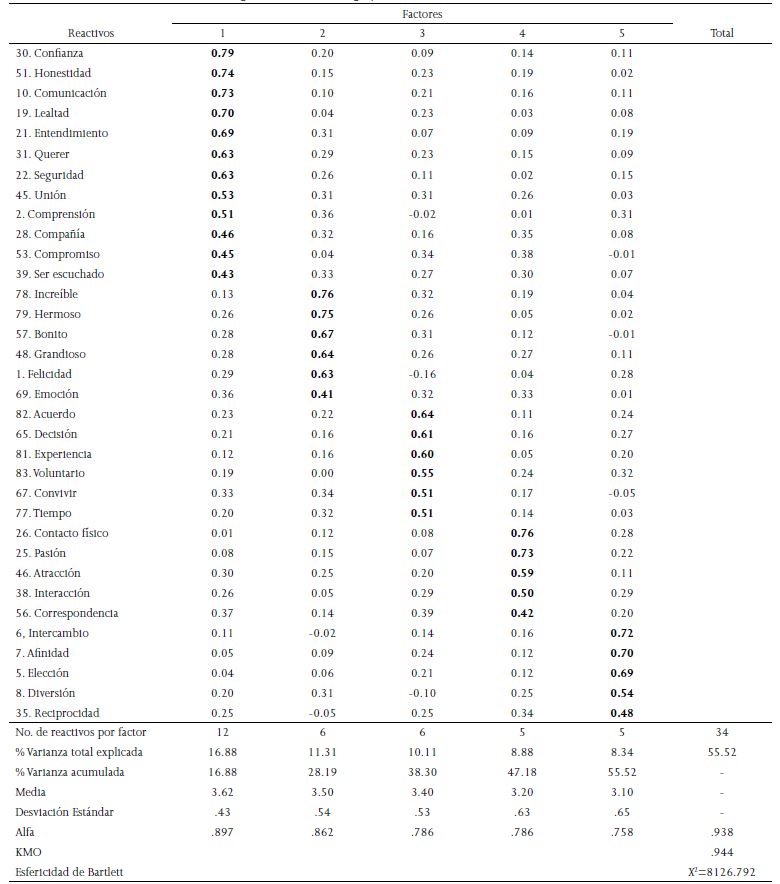 Como se puede ver en la Tabla 2, se obtuvo una escala con 34 reactivos con peso factorial mayor o igual a .40, distribuidos en 5 factores con valor propio mayor a 1, que explicaron el 55.52% de la varianza total. En cuanto a la consistencia interna, la escala total tiene un alfa de Cronbach de .938; por su parte, los coeficientes de consistencia interna por factor son: Amor de compañía (α=.897), Idealización positiva (α=.862), Compromiso (α=.786), Pasión (α=.786), e Intimidad (α=.758). Asimismo, para verificar que la matriz de correlaciones en la que se basó el análisis factorial fuera adecuada, se obtuvo la medida de adecuación muestral de Kaiser-Meyer-Olkin (KMO=.944) y el análisis de esfericidad de Barttlet (X2 [561]=8126.792, p<.001). En la Tabla 3 se observa la definición de cada uno de los factores que componen esta subescala.