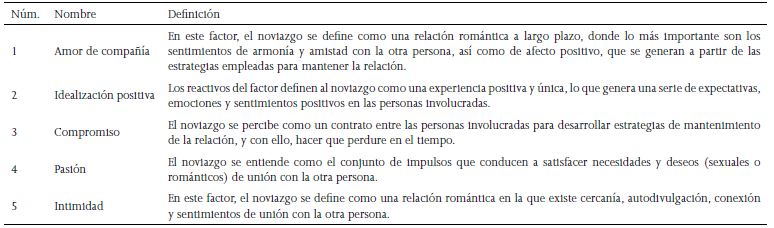 El primer factor obtenido en la subescala de Significado del noviazgo, permite visualizar que los adolescentes perciben el noviazgo como una relación de amor de compañía. En este sentido, durante esta etapa de la vida se perciben sentimientos de afecto hacia una persona con la que se tiene un vínculo profundo (Hatfield, 1988); además, se percibe un gran cariño hacia esa persona, aún más que en la amistad, y se suma el compromiso por mantenerse en esa relación por un largo tiempo (Sternberg, 1988). De esta manera, se complementa la literatura expuesta por los autores que mencionaron que es más común el amor romántico (combinación de pasión e intimidad) durante esta etapa de la vida (p.e. Arnett, 2008; Zani & Cicognani, 2006).