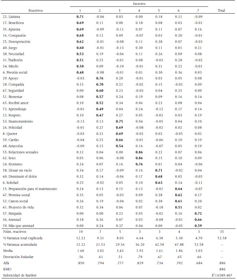 Como se puede ver en la Tabla 4, se obtuvo una escala con 35 reactivos con peso factorial mayor o igual a .40, distribuidos en 7 factores con valor propio mayor a 1, que explicaron el 52.58% de la varianza total. En cuanto a la consistencia interna, la escala total tiene un alfa de Cronbach de .886; por su parte, los coeficientes de consistencia interna por factor son: Necesidad personal (α=.850), Seguridad (α=.794), Enamoramiento (α=.777), Sexualidad (α=-829), Soledad (α=.734), Premisas tradicionales (α=.702) y Afinidad (α=.684). Asimismo, para verificar que la matriz de correlaciones en la que se basó el análisis factorial fuera adecuada, se obtuvo la medida de adecuación muestral de Kaiser-Meyer-Olkin (KMO=.886) y el análisis de esfericidad de Barttlet (X2 [666]=6589.407, p<.001). En la Tabla 5 se observa la definición de cada uno de los factores que componen esta subescala.