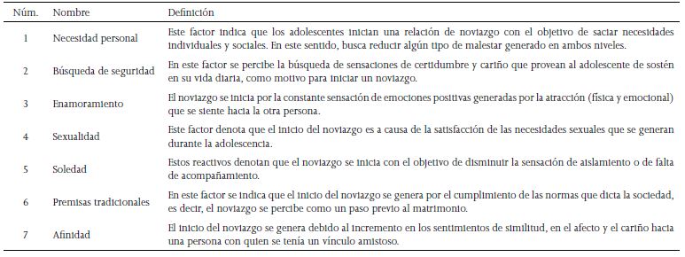 Al primer factor de esta subescala se le dio el nombre de necesidad personal, pues denota que los adolescentes inician un noviazgo con el objetivo de disminuir el malestar que se genera en esta población, tanto a nivel individual como social. De esta manera, se puede ver que el inicio del noviazgo cubre las dos perspectivas mencionadas. Por un lado, el noviazgo se inicia por el desarrollo socioemocional y saciar necesidades afectivas (Arnett, 2008; Nahoul & González, 2013); por otro, el noviazgo se percibe como una interacción estratégica que provee de beneficios sociales, tal como estatus o reconocimiento por parte de sus pares (Kimmel & Weiner, 1995, Perinat & Corral, 2003). Con este factor se resalta que el desarrollo emocional, a través de los primeros noviazgos, también obedece la norma social planteada por el grupo de pares (Furman & Collibee, 2014).