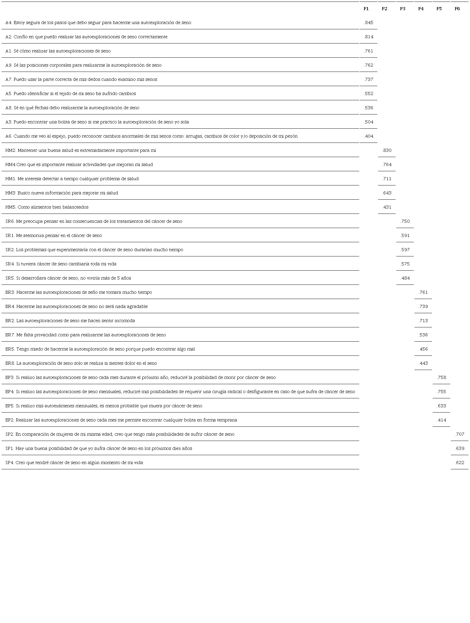 Asimismo, en la escala de beneficios percibidos, el BP1: Cuando me realizo la autoexploración mensual de mis senos no me preocupo tanto por el cáncer de seno. El hecho de que este ítem no se integre con los demás como parte del factor de beneficios, podría estar reflejando lo opuesto a lo planteado en el ítem ya que el encontrar un abultamiento al realizar la AEM generaría preocupación (Parsa et al., 2008). Sin embargo, esta idea se descarta al observar que el preocuparse por el cáncer no es una barrera para la AEM ya que el ítem BR1: Realizar las autoexploraciones de seno durante el próximo año hará que me preocupe por el cáncer de seno, también fue eliminado por su baja carga factorial. Otra posible explicación es que BP1 tiene una redacción negativa, lo que puede afectar su claridad y aumentar la dificultad de respuesta.