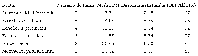 En la Tabla 2 se muestran los valores de la Media (M), Desviación Estándar (DE) y el coeficiente de Alfa para cada factor. Para el caso del factor Susceptibilidad Percibida fueron α= .67 Seriedad Percibida α= .73 Beneficios Percibidos α= .72 Barreras Percibidas α= .77 Autoeficacia α= .87 Motivación para la Salud α= .80 Los valores anteriores ofrecen suficiente soporte de confiabilidad en las puntuaciones de la escala y por subescala.