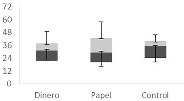El ANOVA de dos vías no mostró efectos estadísticamente significativos para alguna de las dos variables independientes, de modo que no hubieron diferencias causadas por el tipo de prime (F (2,114)=1.225, p=0.298; η2p=0.021), ni por la oportunidad de hacer trampa (F (1,114)=2.866, p=0.093; η2p=0.025). Así mismo, tampoco se observó un efecto de interacción entre ambas variables independientes (F (2,114)= 0.582, p=0.560; η2p=0.010), por lo que se falla en rechazar las tres hipótesis nulas. Por lo anterior, no es posible afirmar que la condición de priming o la oportunidad de hacer trampa influyen sobre el comportamiento deshonesto por sí mismas o en interacción. Es decir, que el dinero no tuvo un efecto sobre el comportamiento deshonesto, en comparación con las condiciones control y neutras. Además, los puntajes de los participantes fueron semejantes sin importar si tuvieron o no la oportunidad de hacer trampa. Así mismo, se observan tamaños de efecto pequeños que indican que la varianza explicada por las variables -tanto de modo individual como en interacción-no impactó de forma importante.
