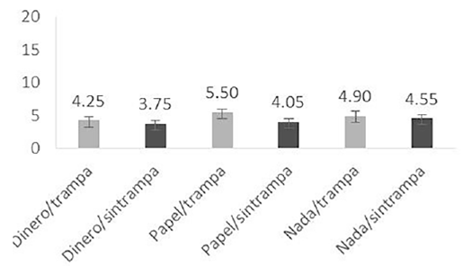 Sin embargo, al obtener la diferencia de matrices resueltas (en la hoja de prueba) y matrices reportadas (en la hoja de reporte de resultados) -confirmada mediante la comparación de la hoja de prueba obtenida del interior de la trituradora de papel trucada, así como mediante el conteo del dinero restante en el sobre después de que los participantes se autopagaban, en las tres condiciones de trampa- se observa que los participantes en las condiciones de trampa reportaron más matrices resueltas de las que en realidad resolvieron, ello se hace evidente también en la mayor cantidad de dinero que reclamaron deshonestamente. En promedio, el grupo dinero/trampa se llevó $4.7, el grupo papel/trampa tomó $5.50, y el grupo control/ trampa se llevó $6.75.