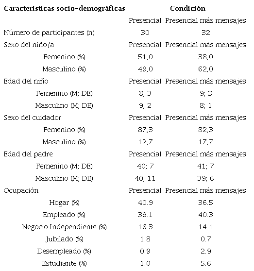 Se trabajó con 62 padres de niños entre los dos y los 12 años de edad del área metropolitana de la Ciudad de México a través de un muestreo por cuota, por conveniencia, que se asignaron aleatoriamente a uno de dos grupos o condiciones de entrenamiento para la comparación de las intervenciones. Los participantes fueron convocados a participar en el programa de entrenamiento conductual a padres en prácticas de crianza desde la comunidad y para llevarse a cabo dentro del ámbito escolar con población no clínica. La media de edad de los padres fue de 40 años. El 87.09% de las personas que participaron fueron mujeres y el 61.29% de los hijos de las personas participantes fueron varones. La Tabla 1 muestra la distribución de promedios y porcentajes de acuerdo a las características socio-demográficas de los padres y sus hijos conforme a las dos condiciones de comparación.