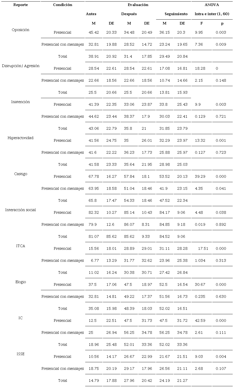 Con relación a la conducta infantil, en la Tabla 2, se puede observar que, en la condición de entrenamiento conductual a padres en formato presencial, la conducta oposicionista desafiante reportada fue en promedio un 10.94% menor al terminar el programa y un 9.27 menor en el seguimiento a los tres meses, con respecto a la primera evaluación; Mientras que en el entrenamiento conductual presencial con mensajes de texto, se observó una reducción reportada del 4.29% al terminar el programa y un 9.57% en el seguimiento (F [1,60] = 9.95, p =.003), con respecto a la primera evaluación. Adicionalmente, se encontraron diferencias significativas en la comparación entre condiciones de entrenamiento, por lo que el nivel de conducta oposicionista desafiante reportada fue significativamente menor en el grupo presencial con mensajes (M = 23.24%) que en el presencial solo (M = 36.15%; F [1,60]=7.36, p=.009), durante el seguimiento.