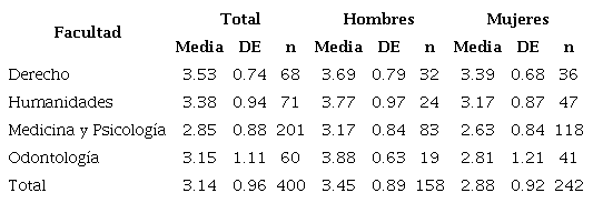 Los resultados obtenidos en este estudio son comparables a los reportados por Gerger et al. (2007) para hombres (M=3.60) y mujeres (M=3.07); al igual que en el estudio de Megías et al. (2011) con muestra española, hombres (M= 3.32) y mujeres (M=2.96).