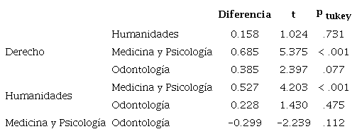 En la Tabla 1 se describen los promedios por cada Facultad. En la Tabla 2 se observa que existen diferencias significativas entre las medias de la Facultad de Medicina y Psicología y la Facultad de Derecho, en relación con los resultados obtenidos del AMMSA, lo que significa que la Facultad de Derecho acepta en mayor grado las creencias más comunes acerca de la agresión sexual. Asimismo, entre estudiantes de Humanidades y de Medicina y Psicología se observó una diferencia significativa, teniendo los estudiantes de Humanidades mayor aceptación hacia mitos sobre la agresión sexual. Entre las demás comparaciones entre facultades no se presentaron diferencias significativas.
