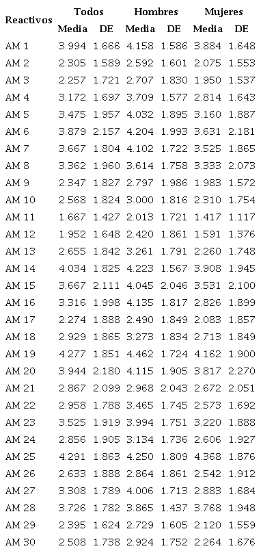La escala AMMSA arrojó una excelente consistencia interna (α = .93), lo cual concuerda con los resultados de la prueba original (α entre .90 y .95), así como con sus adaptaciones a la población española (α = .91) y colombiana (α = .87). Por lo anterior, se conservan todos los ítems para su adaptación al contexto mexicano.