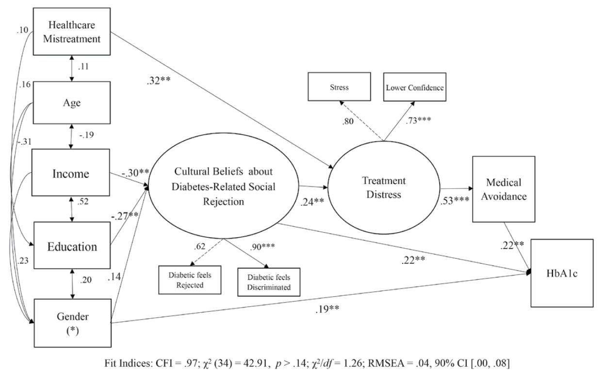 The test of the structural equation model including the theory-based structure of relations among healthcare mistreatment, cultural beliefs, distress, and medical avoidance as determinants of HbA1c, as a biological outcome of T2DM, fit the data well. These results, along with the finding that cultural beliefs associated with the social rejection of T2DM patients influenced HbA1, both directly and through its effect on the level of distress, are particularly significant. The fact that the way patients are treated by their healthcare providers increases the level of treatment-related distress, which in turn leads patients to avoid future medical interactions thereby impacting health outcomes, has major implications for healthcare.