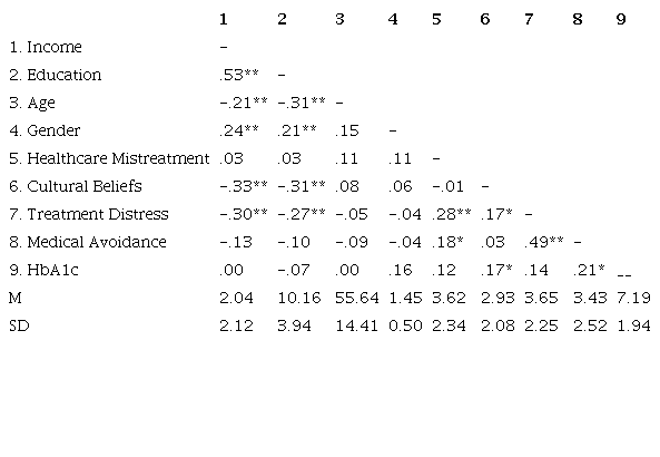 Consistent with the study hypothesis, greater expoure to healthcare mistreatment and higher scores on cultural beliefs about diabetes-related social rejection were associated with higher levels of treatment distress (β = .32, p < .05; β = .24, p < .05), respectively. Higher levels of treatment distress predicted greater medical avoidance (β = .53, p < .05), which in turn predicted higher HbA1c (β = .22, p < .05). In addition, there was a direct effect of cultural beliefs about diabetes-related social rejection on HbA1c (β = .22, p < .05). Gender was also predictive of HbA1c such that males had higher HbA1c levels (β = .19, p < .05). Also consistent with the integrative model guiding this research, lower income and education were predictive of higher scores on cultural beliefs about diabetes-related social rejection (β = -.30, p < .05; β = -.27, p < .05), respectively. Males also reported higher scores on cultural beliefs about diabetes-related social rejection (β = .14, p > .05).
