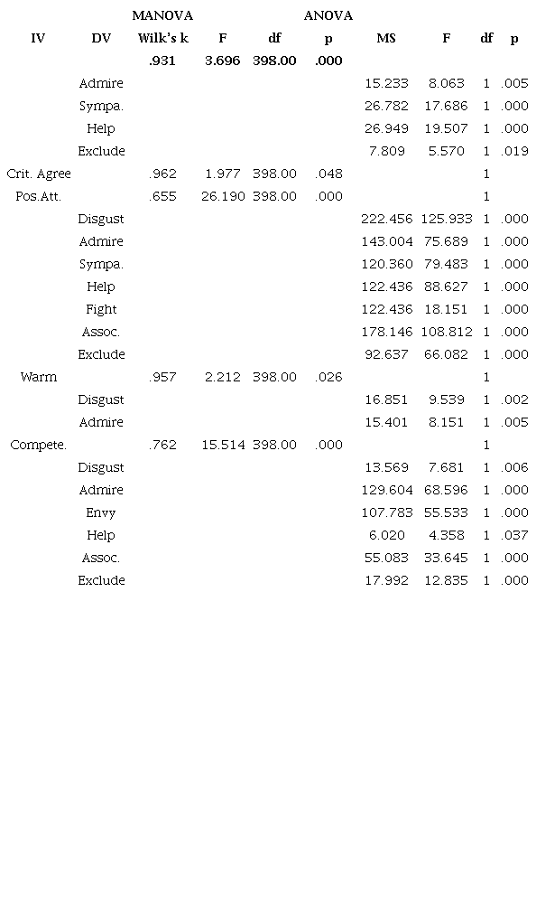 The first three hypotheses were tested using a MANO-VA that allowed 2 dichotomous and their interaction and 5 continuous independent variables to be regressed on 4 emotional (disgust, sympathize, admire, envy) and 4 behavioral (help, fight, associate, exclude) variables. The analysis met assumptions of normality, equality of covariance and absence of multicollinearity. In addition, scatterplot matrices show linearity among the dependent variables. The multivariate tests of this model using Wilks’ Lambda criteria showed that both Warmth (F (8, 398) = 2.21, p<.05) and Competence (F (8, 398) = 15.51, p<.001), but not their interaction, were significant (Table 1). Additionally, two Agreeableness items were significant, (F (8, 398)= 3.70, p<.001) and (F (8, 398) = 1.98, p<.05) including the Positive Attitudes toward Immigrants (F (8, 398) = 26.19, p<.001). The two Openness items were not significant.