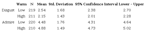 Tests of Between-Subjects Effects were conducted only if the Multivariate tests using the Wilks’ Lambda criteria showed significance. The Warmth manipulation elicited main differences between Low and High Warmth conditions in two emotions: Disgust (F (1, 405) = 125.93, p<.05) and Admiration (F (1, 405)= 75.69, p<.05). Disgust was far more likely to be elicited in the Low warmth and Admiration in the High warmth conditions. See Table 2 for mean differences between conditions for Warmth.