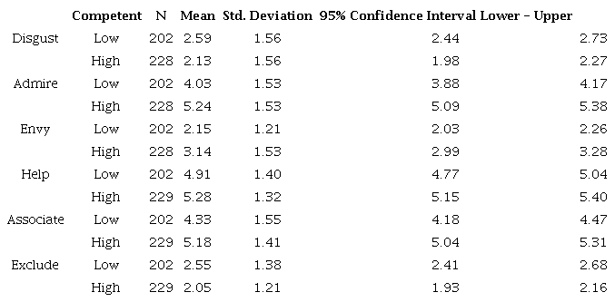 The Competence manipulation elicited significant condition differences for Disgust (F (1, 13.57) = 7.68, p<.05), Admiration (F (1, 129.60) = 68.60, p<.001), Envy (F (1, 107.78) = 55.53, p<.001), Helping (F (1, 6.02) = 4.36, p<.05), Associate (F (1, 55.08) = 33.65, p<.001) and Exclude (F (1, 17.99) = 12.84, p<.001). Table 3 shows mean differences between conditions for Competence. There is less Disgust, greater Admiration and Envy for immigrants in the High Competence condition than those in the Low competence condition. Additionally, immigrants with higher competence were more likely to be Helped, associated with and less likely to be Excluded than immigrants in the low competence condition.