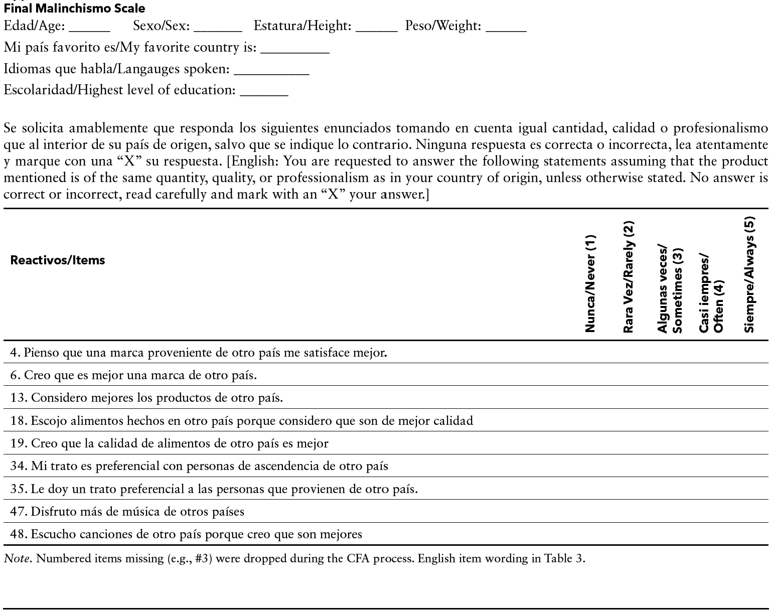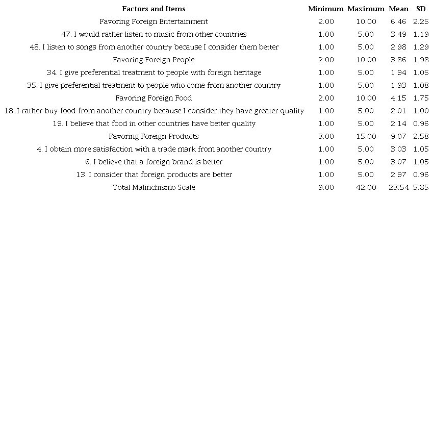 Malinchismo Scale Construction. Altogether 56 items were written to measure malinshismo guided by our understanding of the definition of the construct (per the preceding literature review) combined with general observations of the Mexican society. These 56 scale items were crafted to assess malinchismo in four dimensions: Favoring Foreign Entertainment (10 items), Favoring Foreign People (13), Favoring Foreign Food (13) and Favoring Foreign Products (20). Participants responded to each item on a 5-point Likert-type scale ranging from 1 (nunca/never) to 5 (siempre/always) and reverse-scored items were re-calculated. After a series of steps were completed to assess the validity of the measure (detailed in plan of analysis below), a 9-item Malinchismo Scale remained: Favoring Foreign Entertainment (2 items), Favoring Foreign People (2), Favoring Foreign Food (2) and Favoring Foreign Products (3). See Appendix A for the final Malinchismo Scale.