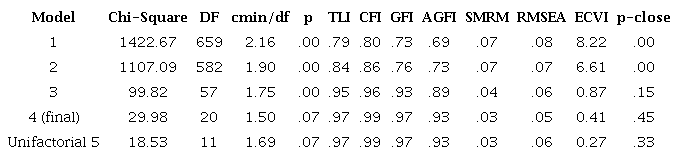 For the content validity, we kept the items that displayed a mean value less than .7 as suggested by Soto and Segovia (2009). Five items with Aiken’s V loadings below .7 were discarded leaving 51 items. The initial mean Aiken’s V was .87 (utility .87, discriminate/classify .86 and semantics .88) and the final value was .9 having a confidence interval with lower limit .66 and upper limit .97. This is considered adequate content validity; therefore; we proceeded with the remaining items.