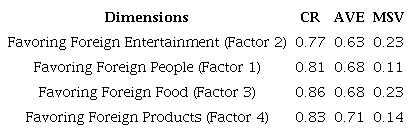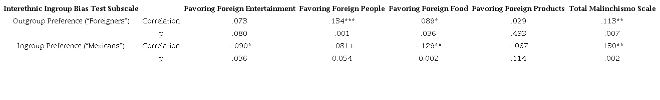 Finally, correlations were computed to assess convergent and discriminant validity with the Interethnic Ingroup Bias Test (See Table 5). As expected, results revealed that malinchismo (Total Score, Favoring Foreign People Subscale, Favoring Foreign Food Subscale Subscale) was significantly and positively correlated with the outgroup preference, and negatively correlated with the ingroup preference (Malinchismo Total Score, Favoring Foreign Entertainment Subscale, Favoring Foreign Food Subscale).