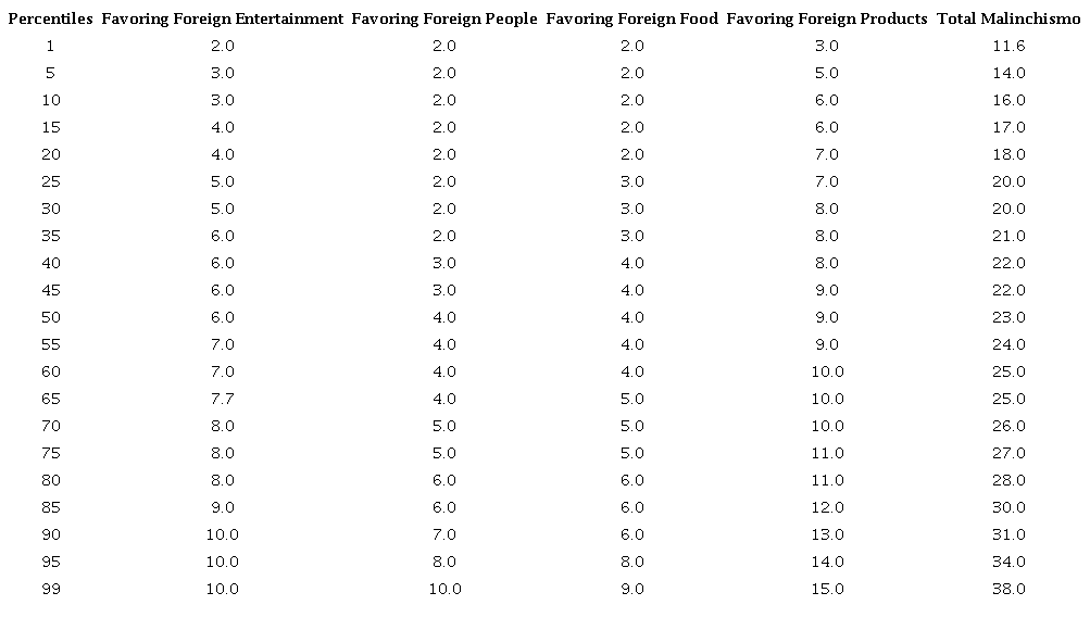 Malinchismo can be explained by post-colonial theory (doting gaze of people in post-colonial nations towards neo-colonial capitalist nations/culture: Ashcroft, Griffiths, & Tiffin, 1995), social identity theory (self-selected favoring of the outgroup: see Tajfel & Turner, 1986), and remote acculturation theory (malinchismo is a form of remote assimilation via globalization: Ferguson, 2013). The overall mean on our Malinchismo Scale shows a moderate degree of malinchismo in this adolescent sample overall, as well as a moderate degree of favoring foreign entertainment and foreign products, with a low level of malinchismo in terms of favoring foreign people and foreign food.