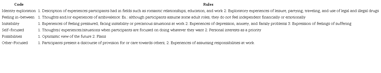 The program NVivo (version 10) was used in the process of categorizing data. Initially, the first author read all the interviews in order to have a general view of all participants’ experiences. The first author then selected paragraphs that expressed participants’ personal experiences and opinions and coded them with respect to the six themes of analysis. Afterwards, one coder participated in the process of categorizing the data, which was selected based on their familiarity with topics related to youth and transition to adulthood using a guidance (see Table 1). The coder accessed the entire content of the interviews and was guided in analyzing the selected paragraphs and code them considering the six themes of analysis. The concordance coefficient among coders (Cohen’s Kappa coefficient - K; Robson, 1995) reached levels of excellence, varying from 0.74 to 0.88, with general K of .83. A consensual discussion between coder and the first author was carried in the process of the K calculation. Subsequently, through the analysis of the six categories, the first author included SES as an aspect to be analyzed.