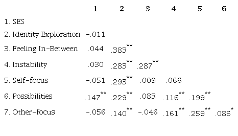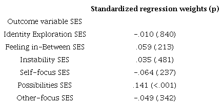 Results indicated that SES was not associated with the mean scores of IDEA’s dimensions. Bivariate analysis indicated a positive correlation between SES and the IDEA’s dimension Possibilities, however, the effect size was low (< .30; see Table 2 and 3). Thus, the study’s hypothesis that low SES would be associated with lower mean scores of “Identity Exploration” and “Possibilities”, and higher mean scores of the “Other-focus” (Arnett, 2011; Galambos & Martínez, 2007) was not sustained by the proposed model, what may indicate that young individuals from both the low and high SES would experience EA (Arnett, 2004, 2006, 2011).