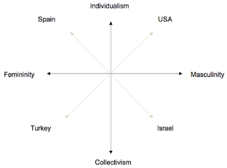 In this study we analyze relational variables of women from four countries which represent different combinations of IND-COL and MAS-FEM. As illustrated in Figure 1, USA is classified as a highly individualist culture, with a tendency toward masculinity (Hofstede, 2001). Turkey is considered a collectivist and feminine country, showing a great inclination to develop the equality, consensus and friendliness; avoiding the conflicts and giving importance to the consensus (Hofstede, 2001). Regarding Israel, Hofstede (2001) showed that it was a country with both individualist and collectivist characteristics. However, Triandis (1995) and Sagy, Orr and Bar-On (1999) classified it as collectivist society with a “great local patriotism”. Therefore, in the present study we followed these researches’ observation and considered it collectivistic. In terms of masculinity, although Israel is consider neither masculine nor feminine (Hofstede, 2001) when compared with Spain and Turkey, it would be closer to the masculinity end. For that reason, in the present study we have considered Israel as relatively masculine.