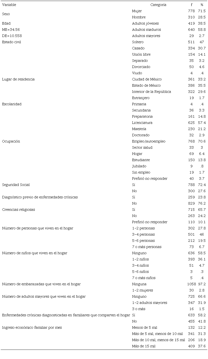 Dadas las medidas de distanciamiento social, se optó por un muestreo no probabilístico de bola de nieve con aplicación de una encuesta en línea. Se obtuvo un índice de respuesta del 99.5%, ya que seis personas no proporcionaron su consentimiento. Además, los datos de 50 participantes fueron excluidos, 44 por no cumplir el criterio de edad ≥18 años y seis más debido a la detección de repeticiones, esto es, la identificación de dos o más registros iguales en un lapso de 3 a 6 minutos; omisiones, es decir, casillas vacías en la sección de datos sociodemográficos; así como respuestas no congruentes, a saber, información no correspondiente con la pregunta. Por tanto, la muestra final estuvo conformada por 1088 participantes cuyas características sociodemográficas se puntualizan en la Tabla 1.