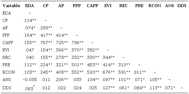 En la Tabla 2 se observan las diferencias y asociaciones entre las respuestas psicológicas iniciales ante COVID-19 y las variables sociodemográficas, donde la mayoría resultó significativa (p < .05). Ahora bien, en la Tabla 3 se muestran las correlaciones entre las respuestas psicológicas iniciales y las variables edad y días de distanciamiento social. Aunque la mayoría de las correlaciones fue significativa (p < .05), resultaron entre débiles y medias, en particular para la variable ansiedad.