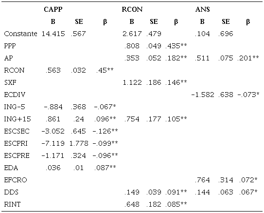 Finalmente, mediante el análisis de regresión lineal múltiple, se identificaron modelos de factores predictores para los conocimientos, actitudes y prácticas de salud percibidas (R=.586; R2=.344; AR2=.34), para las respuestas conductuales (R=.622; R2=.387; AR2=.384) y ansiedad (R=.239; R2=.057; AR2=.054) como respuestas psicológicas iniciales ante la pandemia (ver Tabla 4).
