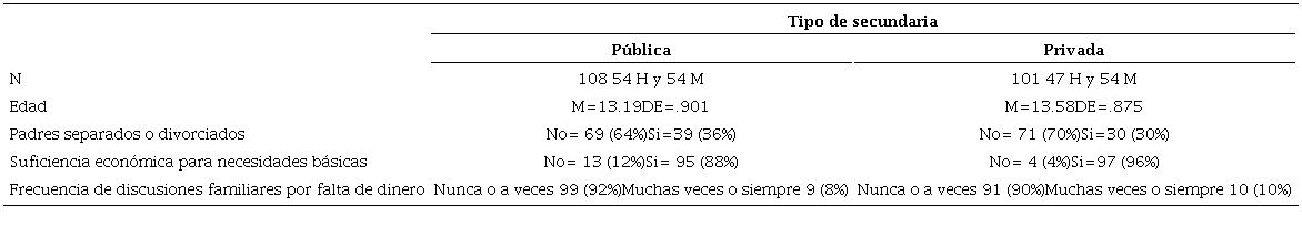 Es una investigación, no experimental, realizada con un enfoque de tipo cuantitativo de corte transversal, con diseño de comparación de dos casos típicos. La población consistió en estudiantes de nivel secundaria en turno matutino de la ciudad de Tepic, Nayarit. Mediante el método de muestreo por conveniencia se eligieron dos centros educativos, uno de ellos de tipo público y otro de tipo privado, ubicados en la misma zona geográfica de la ciudad. La secundaria de tipo público cuenta con la infraestructura y personal para ofrecer el modelo básico de educación, su alumnado es por lo general de clase económica media y media baja. A la secundaria privada asiste población de clase media alta y alta, cuenta con servicios de psicopedagógico, infraestructura informática, proporción reducida de estudiantes por docente, así como mejores instalaciones. El tamaño de la muestra de participantes, se calculó mediante el programa estadístico Mac Stat con una significancia del 95% y un margen de error de .01, tomando en consideración las listas de estudiantes inscritos, determinándose una muestra de 108 participantes (54 hombres y 54 mujeres) de una población de 748 para la escuela pública y 101 participantes (47 hombres y 54 mujeres) para la escuela privada, cuya población era de 181. Mediante muestreo aleatorio por cuotas se eligieron participantes de los tres grados de secundaria, quedando equiparadas las muestras; en la escuela pública participaron 18 hombres y 18 mujeres de cada grado. En la escuela privada, también fue el mismo número para el segundo y tercer grado, no así para el primero, que se constituyó por 11 hombres y 18 mujeres. Las características sociodemográficas destacables se muestran en la Tabla 1, en donde se revisa que, en su mayoría, los adolescentes viven con ambos progenitores y que no tienen problemas económicos para solventar sus necesidades básicas que generen discusiones familiares.