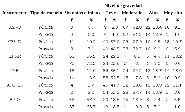 Para el análisis de la información, se utilizó el Paquete Estadístico para las Ciencias Sociales (IBM SPSS© v. 22). Al efectuar el análisis de fiabilidad en cada sub-escala de los instrumentos, aquellos resultados categorizados como “muy baja” o “baja” se evitaron para el análisis posterior de los datos. De los descriptivos de mayor interés para identificar posibles casos clínicos, se efectuó un análisis de sintomatología depresiva encontrando mayor número de casos con diversos síntomas de problemática en estudiantes de la escuela pública como se revisa en la Tabla 2. Para esta categorización se utilizó la mediana y las desviaciones estándar.