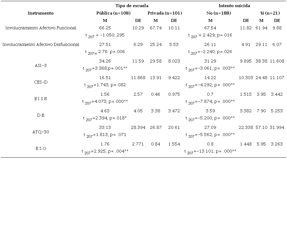 Asimismo, cabe destacar que a excepción de la sub escala de involucramiento afectivo funcional, del instrumento para detectar niveles de depresión (CES-D), así como el instrumento de pensamientos automáticos (ATQ-30), todas las demás pruebas (ASI-3, E.I.S.R, D.B, E.S.O) junto con la sub escala de involucramiento afectivo disfuncional, arrojaron diferencias estadísticamente significativas mediante la prueba t de Student al comparar la muestra de la escuela pública y la privada, en donde el plantel escolar público obtuvo puntajes más altos, mismos que los ponen en un riesgo de suicidalidad mayor.
