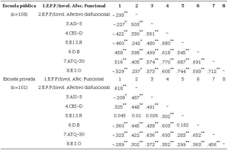 De la comparación de medias se desprende que en la escuela pública el grupo de adolescentes presenta más sensibilidad a la ansiedad y desesperanza, obteniendo mayores puntajes en la ideación suicida y por ende en la suicidalidad. Quienes ya han efectuado un intento suicida, presentan más síntomas de ansiedad y depresión, desesperanza, tienden a autosabotearse con pensamientos automáticos y tienen un involucramiento disfuncional con su familia. Ahora bien, al realizar los análisis de correlaciones entre los instrumentos, destaca en la muestra de estudiantes de secundaria pública que las correlaciones más fuertes fueron entre el los pensamientos automáticos y la depresión (ATQ-30 y CES-D; r=.770), entre la suicidalidad y la ideación suicida (E.S.O. y E.I.S.R, r=.744) y entre la suicidalidad y los pensamientos automáticos (E.S.O y ATQ-30, r=.712). Mientras que en estudiantes de la secundaria privada destaca, aunque no con la misma fuerza, la correlación entre ATQ-30 y la CES-D (r=.693), entre el ATQ-30 y la D.B (r=.652) y entre el ATQ-30 y el ASI-3 (r=.636) como se muestra en la tabla 4.