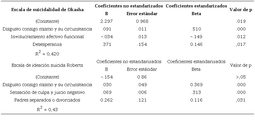 Para revisar cuál de los factores pudieran representar mayor riesgo para la suicidalidad, en el grupo total de adolescentes de ambos planteles, se efectuaron dos análisis a través de regresión lineal múltiple, por el método de pasos sucesivos, tomando como variable dependiente en uno el riesgo suicida en los últimos 12 meses, evaluado a través del instrumento de Okasha, y en otro, el riesgo para la semana anterior a la aplicación, evaluado por los reactivos del instrumento de Roberts, obteniéndose como predictor de esta variable, en ambos análisis el disgusto consigo mismo y su circunstancia, en donde los puntajes más altos fueron obtenidos en los reactivos 6. Siento que no puedo seguir y reactivo 9. Mi vida está siguiendo un curso que no me gusta. Cuando se toma en cuenta la temporalidad de la idea suicida en el último año, se registra en adolescentes problemáticas en sus relaciones afectivas, lo cual los puede llevar a la desesperanza (ver Tabla 5).