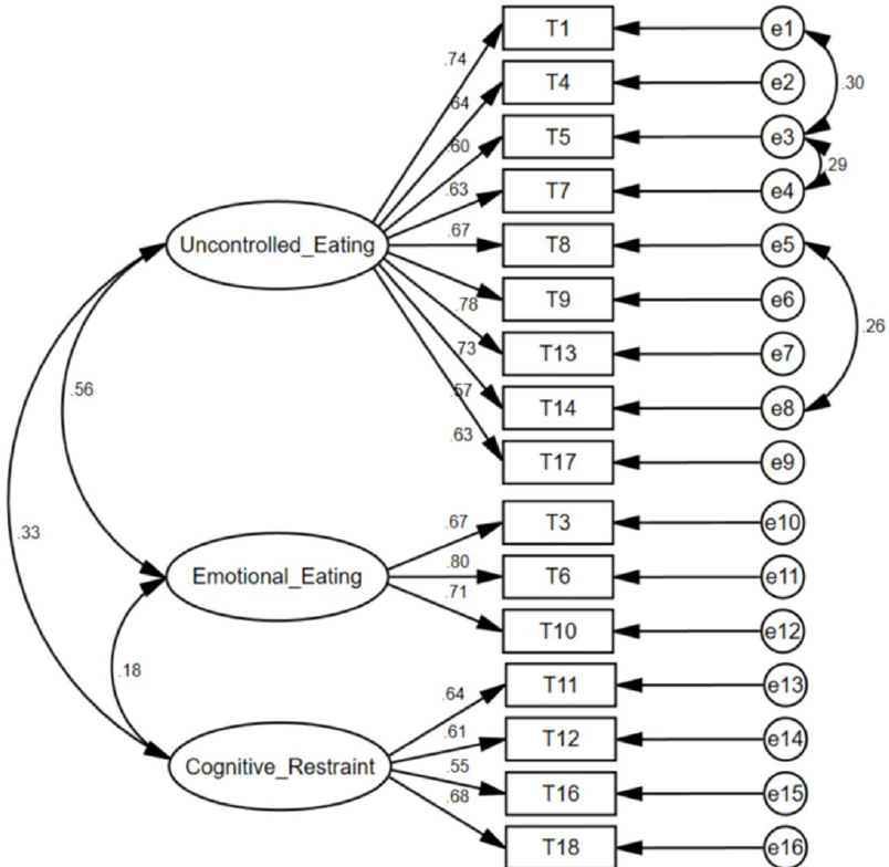 Confirmatory factor analysis evaluated the model fit with three sub-scales, with 18 items and 16 items. A better model fit was obtained removing items 2 and 15. See Table 3. In addition, following the indications from the modification indices for the model fit optimization, we associated the errors of items related to hunger on the Uncontrolled Eating scale. The factor structure of the TFEQ-R16 is depicted in Figure 1. Further analysis was conducted with 16 items: keeping the original structure of Emotional Eating and Uncontrolled Eating, and with 4 items of Cognitive Restraint.