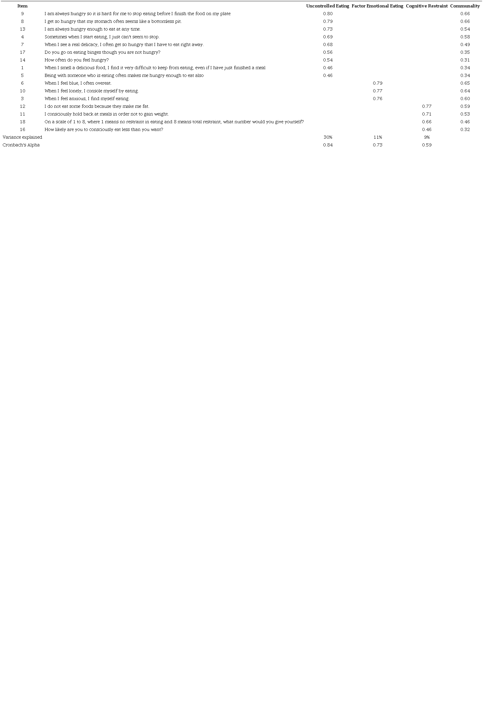 According to the principal component analysis with a Varimax rotation, the original three factor structure was replicated, with the following number of items per sub-scale: Uncontrolled Eating with 9 original items, Emotional Eating with 3 original items, and Cognitive Restraint with 4 items, out of original 6. Item communalities ranged from .32 to .66. Communalities of 11 out of the 16 items were >.45. The three-factor solution accounted for 50% of the total variance. A rotated component matrix indicated that each of the 16 items loaded positively to one of the three factors. Items with factor loadings >.40 are presented in Table 2. Using Maximum likelihood extraction with Quartimax rotation produced similar factor structure and high item loadings.