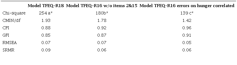 Overall, we conclude that construct validity of the TFEQ was good. Our results corroborate earlier findings suggesting that the TFEQ is a valid measure of eating behavior among population of varying weight: from normal weight to obese. The three-factor solution has been corroborated also in French adults’ sample, with multitrait/multiitem scaling analyses showing satisfactory internal consistency (de Lauzon et al., 2004), the coefficients ranged from .83 for Uncontrolled Eating to .87 for Emotional Eating. The three factor solution was also confirmed via CFA in Chile sample of healthcare professionals, obtaining good internal consistency, with the following Cronbach’s alpha coefficients: .88 UE, .90 EE and .85 for CR. Slightly lower value for alpha for Cognitive Restraint, compared to other sub-scales, was also found in the Swedish obese subjects’ study were:.76 CR,.83 UE, .85 EE (Karlsson et al, 2000); or in the study with young Finnish females: .75 CR, 0.85 UE, and 0.87 for EE (Anglé et al., 2009). In this study CR had the lowest Cronbach’s alpha among three sub-scales, which might be also related to the elimination of two items. Additional studies may help to optimize the CR sub-scale.