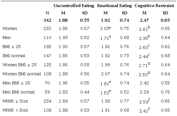Means and standard deviations per scale are presented in Table 4. Mean scores on the three domain scores reported by gender (male, female) showed that mean domain scores were comparable for Uncontrolled Eating and meaningfully different for male and female samples for Emotional Eating and Cognitive Restraint, with females having more tendency to exercise emotional eating and cognitive control than men.
