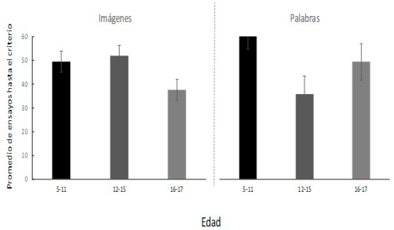 Como se observa en la figura, para las imágenes el promedio de ensayos hasta el criterio fue muy similar para los participantes entre 5 y 15 años, y disminuyó para los participantes de 16 a 17 años. Con respecto a las palabras, el promedio de ensayos hasta el criterio disminuyó del primero al segundo grupo de participantes, y aumentó sensiblemente en el tercer grupo.