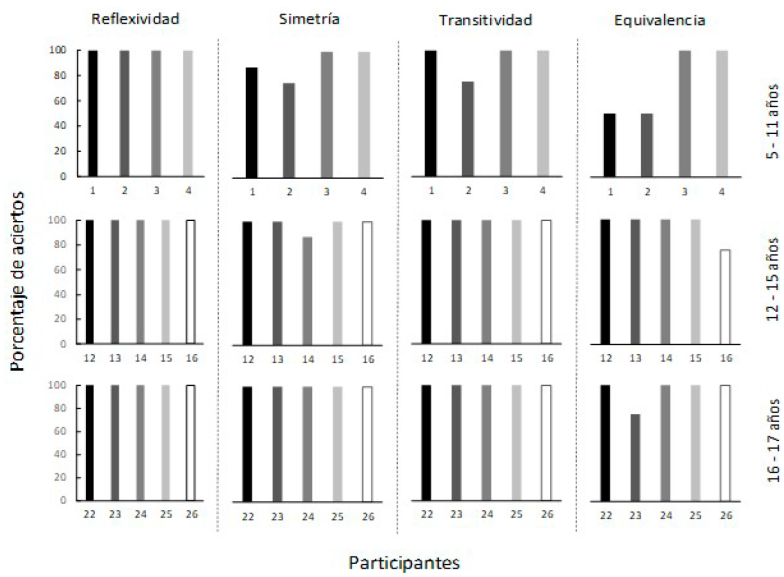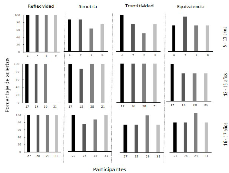Con relación a la prueba de Reflexividad, a excepción del participante número 21, todos los demás participantes obtuvieron el 100% de ensayos correctos. En la prueba de Simetría cero de cuatro, tres de cuatro y uno de cuatro participantes alcanzaron el 100% de ensayos correctos para los grupos de 5-11, 12-15 y 16-17 años, respectivamente. En la prueba de Transitividad uno de cuatro, cuatro de cuatro y uno de cuatro participantes obtuvieron el 100% de ensayos correctos para cada uno de los tres grupos de edad. En la prueba de Equivalencia, para cada uno de los tres grupos, solo uno de sus cuatro participantes obtuvo el 100% de ensayos correctos.