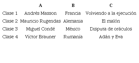 Se usó el programa de PowerPoint para presentar imágenes o palabras como estímulos que compusieron los ensayos del estudio. El arreglo de los ensayos se basó en los reportados por Caballero (2015) y por Ávila, García, Gutiérrez y Baltazar (2019). Específicamente, se seleccionaron 24 estímulos, clasificados en 4 clases y cada una de estas formada por tres elementos, denominados A, B y C. El elemento A se definió por el nombre (palabras escritas) o la fotografía de un "Pintor" (imágenes). El elemento B se definió por el "País natal del pintor" identificado con la bandera de éste (imágenes)3 o el nombre de su país (palabras escritas). Por último, el elemento C, se definió por la "Obra del pintor" y esta fue la pintura (imágenes) o el nombre de la obra correspondiente (palabras escritas). Las diferentes clases de estímulos se presentan en las Tablas 1 y 2.