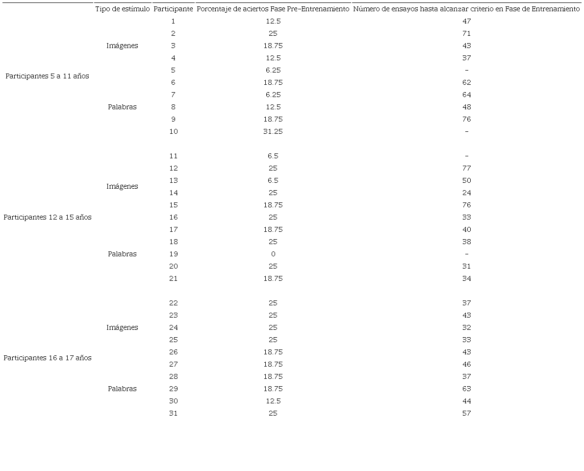 Como se mencionó en la sección anterior, en el Pre-Entrenamiento se registró el porcentaje de aciertos que debía ser menor o igual al 25% para garantizar que los participantes desconocían los estímulos que se emplearon como estímulos muestra y de comparación. En el entrenamiento, conforme al criterio de aprendizaje empleado (20 ensayos correctos consecutivos), se registró el número de ensayos correctos hasta alcanzar el criterio. En la Tabla 3 se muestran estas variables dependientes para cada uno de los participantes, en las dos fases.