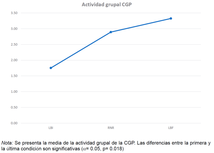 En cuanto a la CGP, los participantes mostraron diferencias significativas entre la LBI, la RNR y la LBF (a= 0.05, p= 0.018) lo que indica que los participantes finalizaban el registro más estresados (más activados simpáticamente) que al inicio (Ver Gráfica 1).