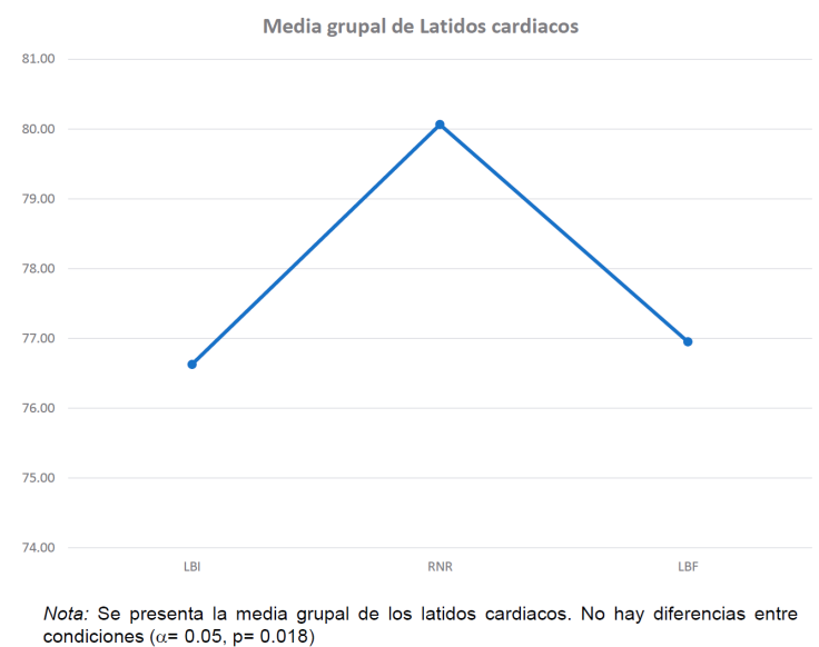Respecto la FC, no se encontraron diferencias estadísticamente significativas entre las condiciones (a= 0.05, p= 0.180). Es decir que, respecto a los latidos cardiacos, las personas permanecían sin cambios en su actividad parasimpática (Ver Gráfica 2).