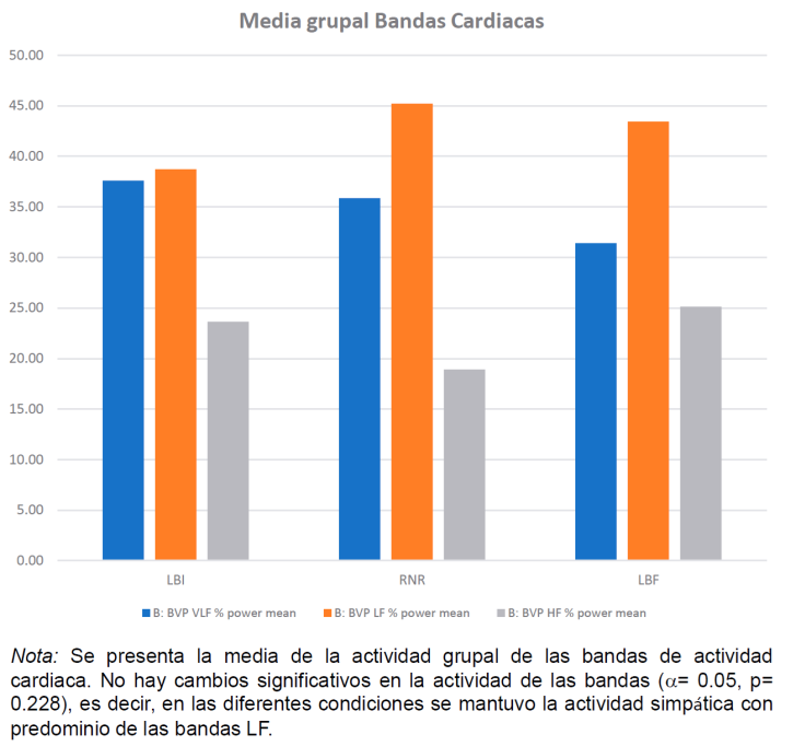 En cuanto a las bandas de frecuencia cardiaca, puede decirse que, durante la LBI, los participantes no mostraron diferencias significativas (a= 0.05, p= 0.102). Durante la RNR, los registros tampoco mostraron diferencias significativas entre las bandas de actividad cardiaca (a= 0.05, p= 0.368). Al finalizar los registros, durante la condición de LBF tampoco se registraron diferencias estadísticamente significativas (a= 0.05, p= 0.276), es decir se mantuvo la tendencia de registros mayores en la banda de LF, seguida de las bandas VLF y finalmente, las bandas de HF. Es decir, había una tendencia a la activación simpática (Ver Gráfica 3).