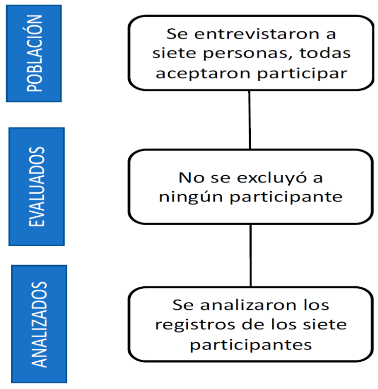En el estudio participaron siete personas tal como puede verse en la Figura 1. La edad mínima de los participantes fue de 43 y la máxima 72 años, siendo la media 54.57 años, con una D.S. de ( 10.4. En el 85.7% de los casos las personas manifestaron estar casadas y pertenecer al género femenino. Sólo una mujer (14,7%) dijo estar divorciada. Tres de las siete personas (el 42.9%) realizaban actividades laborales y las cuatro restantes (57.1%) se desempeñaban como amas de casa. Todos los participantes vivían con su familia de procreación.