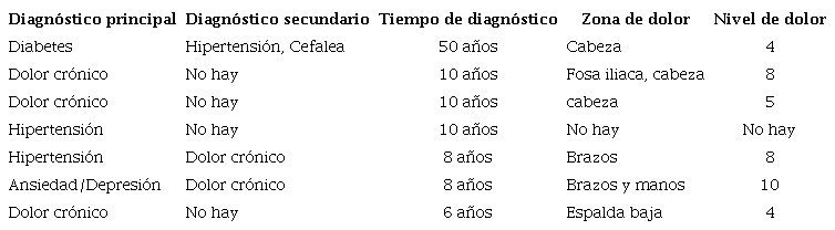 El trastorno más prevalente fue el dolor crónico, el cual estuvo presente en cuatro personas (57.2%), la hipertensión, diabetes y la ansiedad (junto con la depresión) fueron el diagnóstico principal de las tres personas restantes. El 42.9% presentaron dolor crónico como segundo diagnóstico y una persona (14.3%) presentó hasta tres patologías.