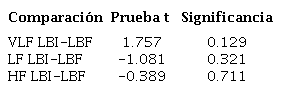 Haciendo una comparación de las bandas de frecuencia cardiaca iniciales (LBI) y las bandas de frecuencia finales (LBF), tampoco se encontraron diferencias significativas. Esto puede verse en la Tabla 2.
