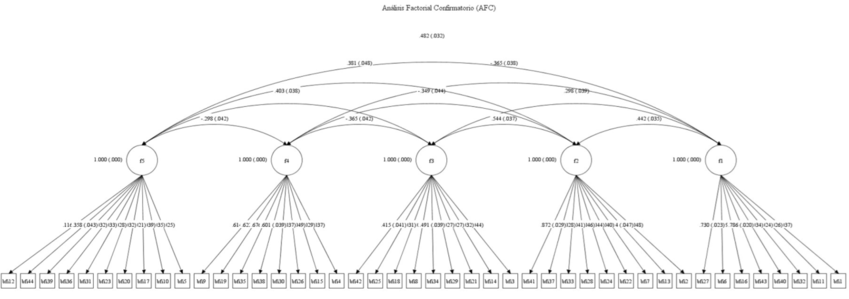 Los análisis factoriales se llevaron a cabo en el programa Mplus7.0 (Muthén & Muthén, 1997-2018) derivado de la naturaleza ordinal de la escala Likert y la falta de normalidad en las variables. Para el AFE se utilizó el método: Media Cuadrática Ponderada y Varianza Ajustada (WLSMV, por sus siglas en inglés) con rotación Oblicua (Geomin) ya que, algunos coeficientes en la matriz de correlación superan el criterio (r > .32). Se forzó la extracción de 5 factores para facilitar la comparación con la estructura teórica original de la prueba. El análisis muestra adecuados índices de bondad de ajuste para el análisis exploratorio (CFI:.904, RMSEA:.049, SRMR:.044).