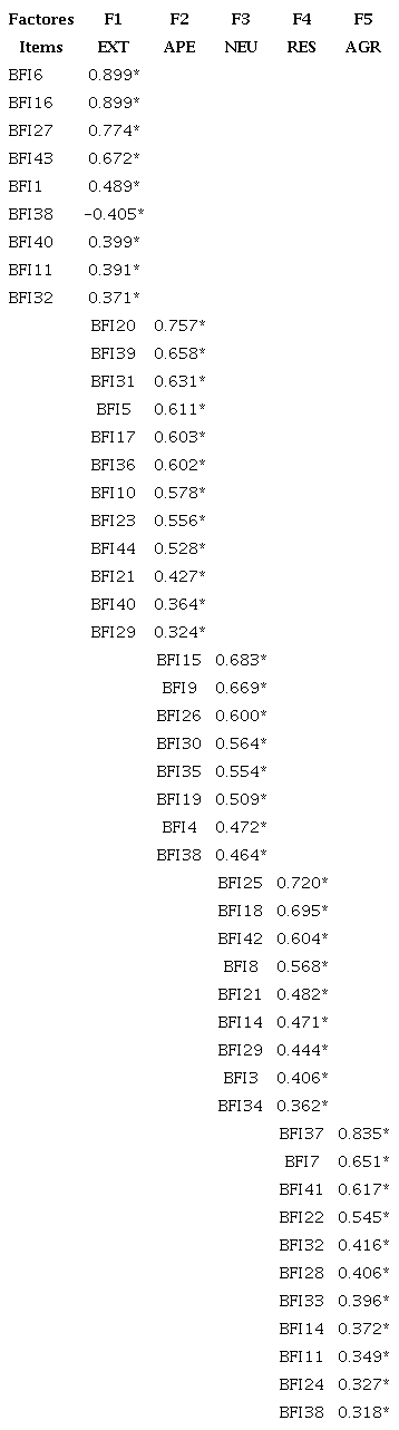 En lo que respecta a las correlaciones positivas entre los factores Agradabilidad con Apertura a la Experiencia supera r = .303 en este mismo sentido, Extraversión con Apertura a la Experiencia r = 0.237 y negativamente la Responsabilidad con el Neuroticismo r = -0.203. Estas correlaciones podrían interferir con la estructura factorial.