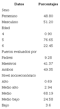 Se contó con una muestra total de 539 niños, que cursaban el tercer año de nivel preescolar, de entre cinco y seis años de edad, pertenecientes a 10 escuelas preescolares de sector público (seleccionadas de forma aleatoria). De los cuales 48% son de sexo femenino y 52.2% masculino. Los padres y los maestros/as de aula regular respondieron los cuestionarios (ver Tabla 1 para descripción de la muestra).